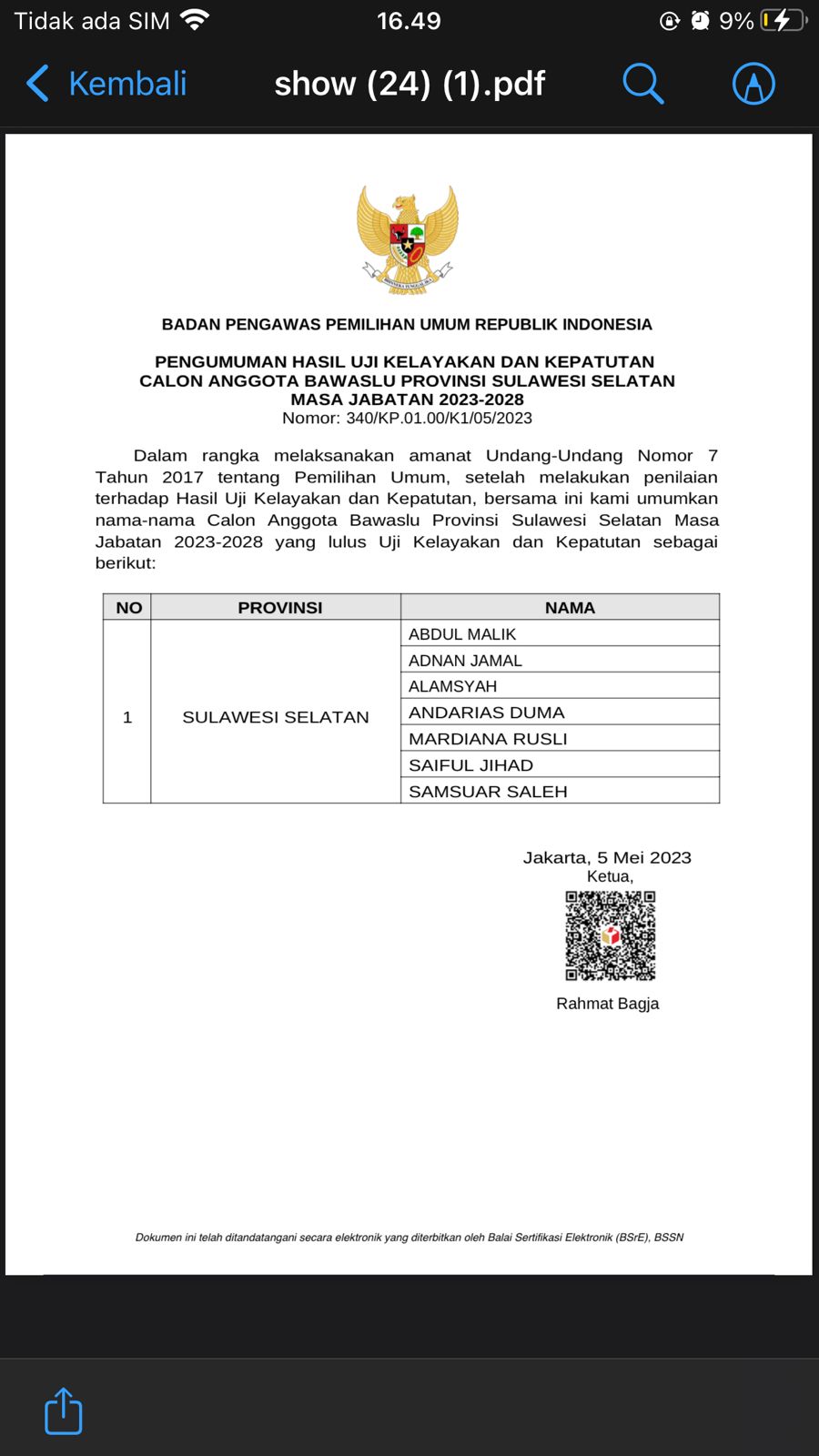 Berikut nama-nama Komisioner Bawaslu Sulsel periode 2023-2028 yang disalin dari surat Bawaslu RI: