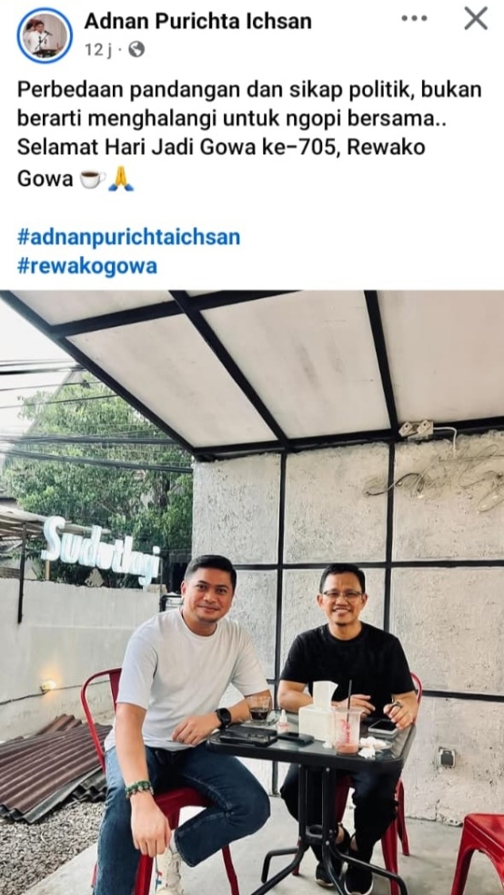 Caption di Facebook :Adnan Puritcha IYL dan Amir Uskara sedang ngopi bareng di kedai, di momen Hari Jadi Gowa Ke-705 ||[email protected]
