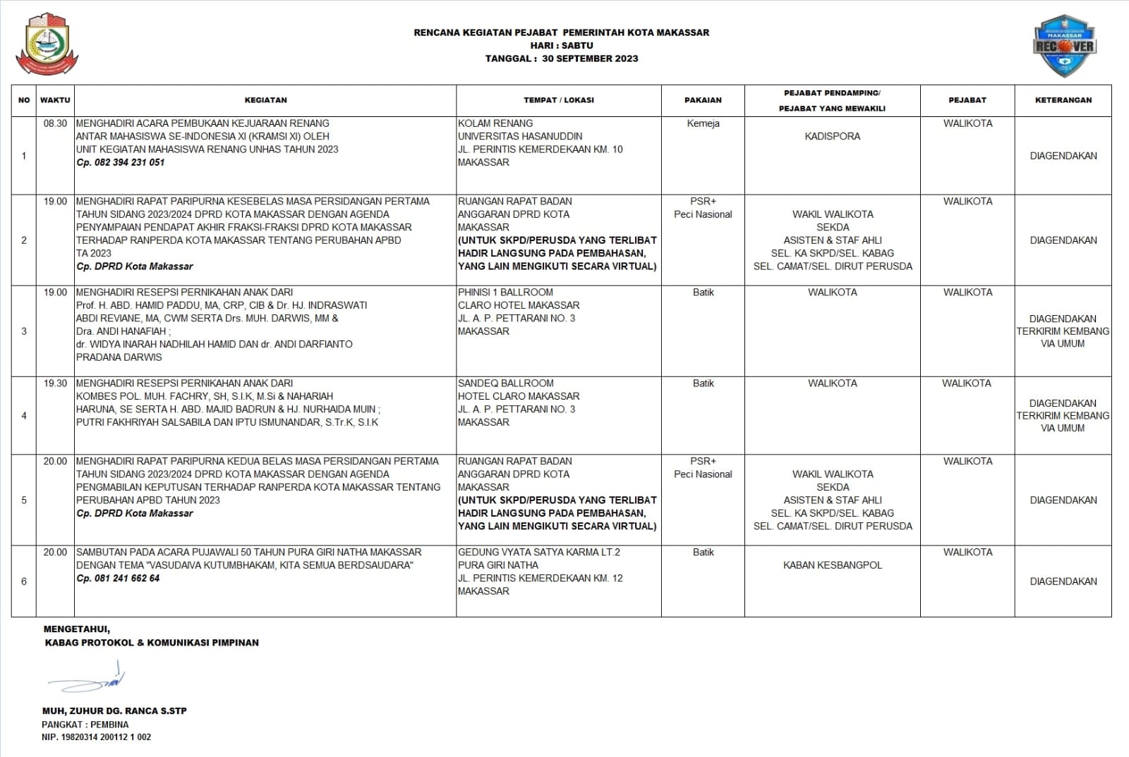 Seperti hari agenda 30 September 2023 di sher hari ini. Berikut agenda Pejabat Pemkot Makassar besok :
