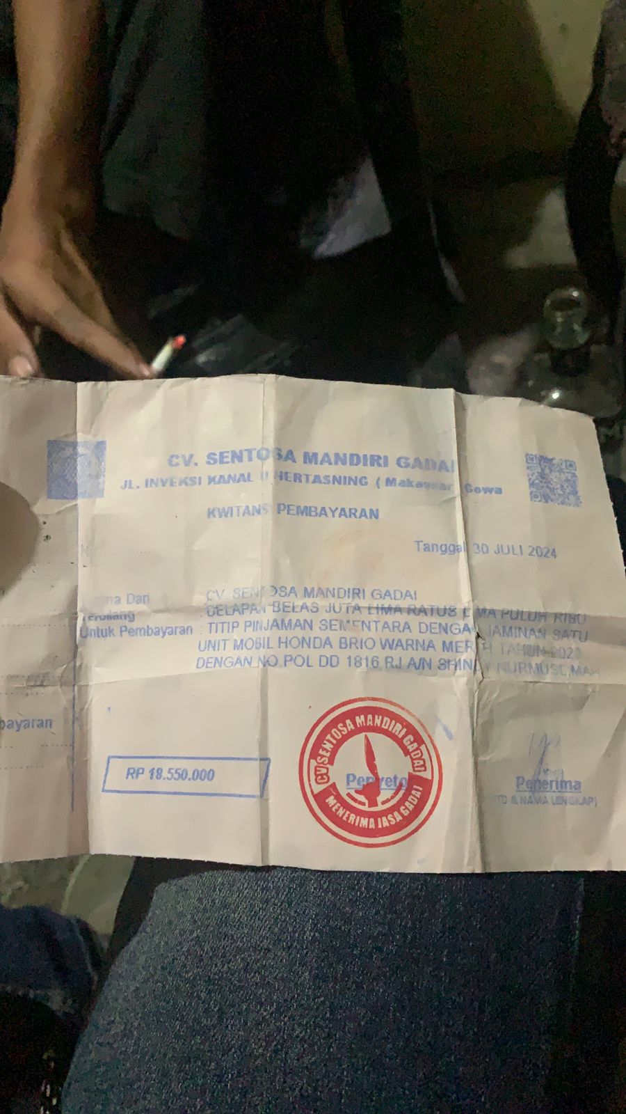 Satu unit mobil Honda Brio Satya nomor polisi DD 1816 RJ berwarna merah, yang diserahkan ke Muh Zulfikram untuk dirental, ternyata digadai di jasa titip gadai di CV. Sentosa Mandiri Gadai yang beralamat di Jl. Inspeksi Kanal Hertasning (Makassar – Gowa).