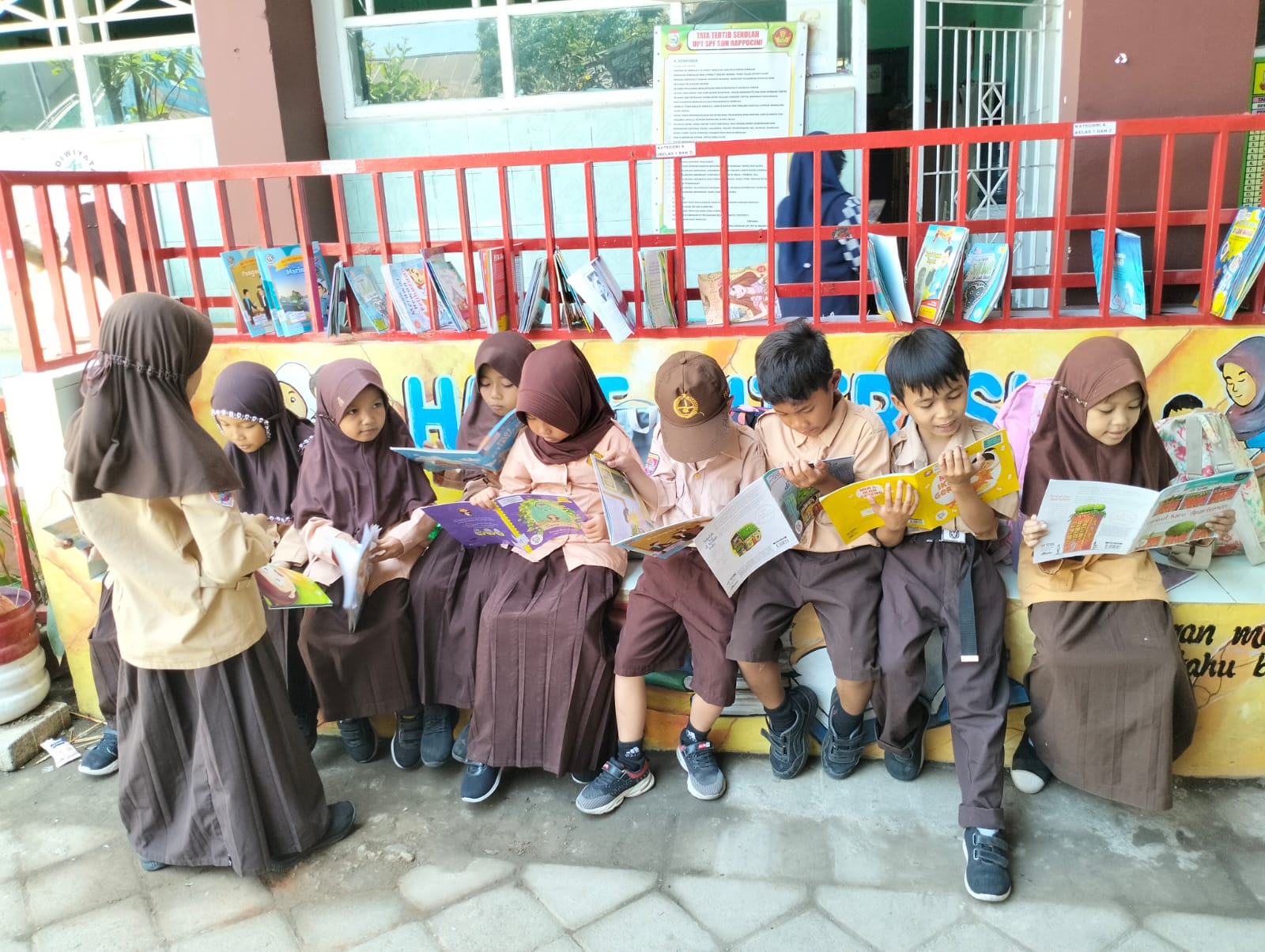 Tampak, sekolah kreatif memanfaatkan kebiasaan orangtua yang menunggu anaknya pulang sekolah. Daripada cuma duduk-duduk ngobrol, sekolah lantas membuat Halte Literasi ini.