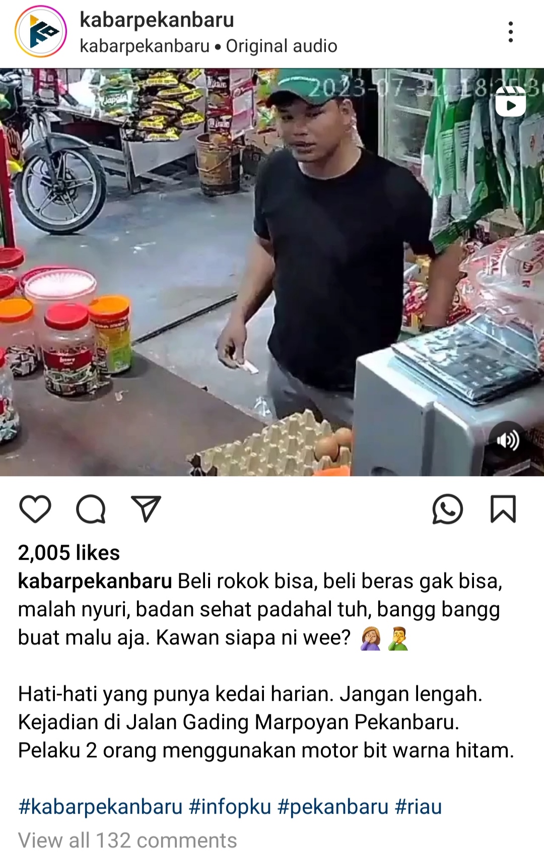 “Hati-hati yang punya kedai harian. Jangan lengah. Kejadian di Jalan Gading Marpoyan, Pekanbaru, Provinsi Riau,” tulis admin 2 hari lalu dalam postingannya.