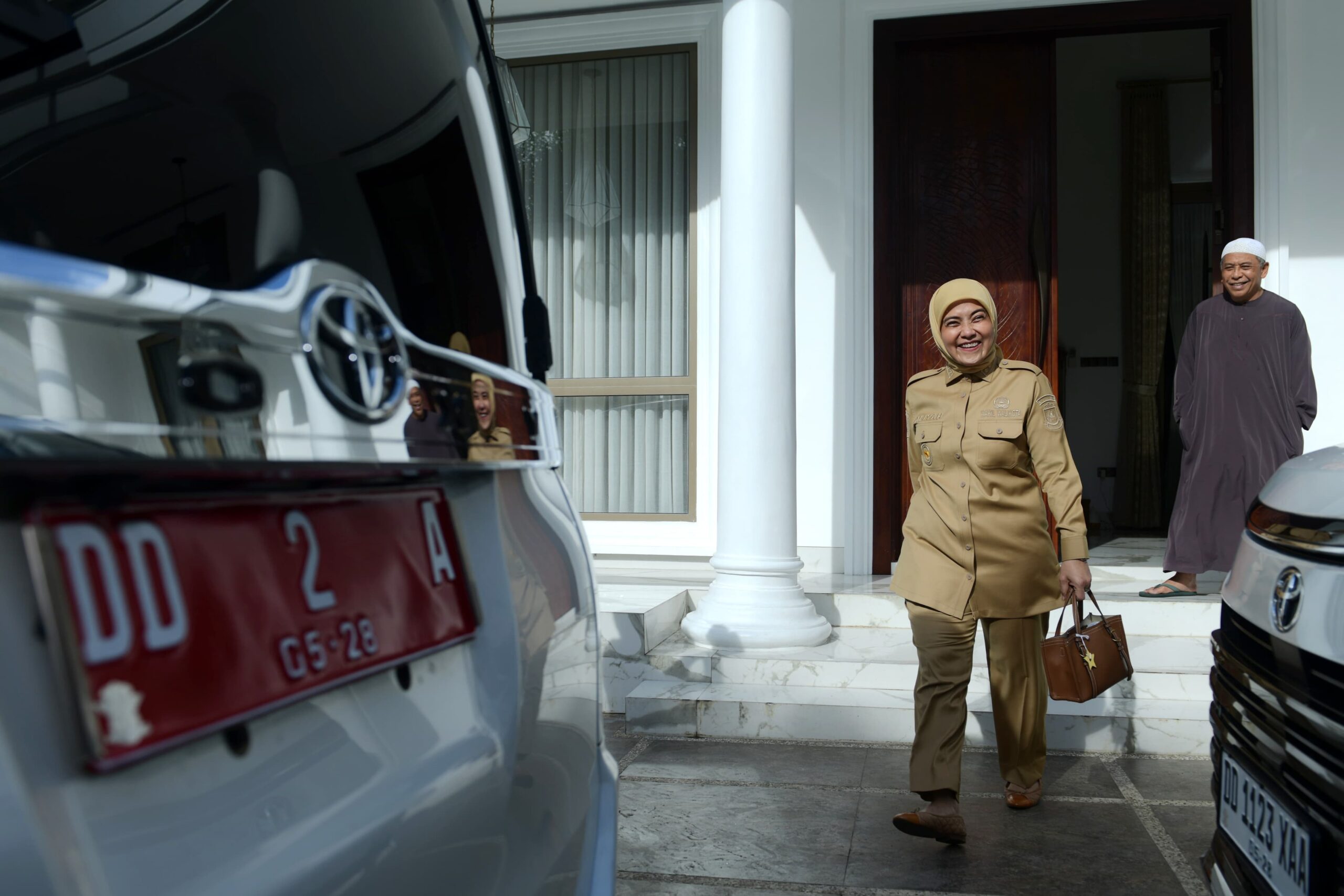 Dalam sebuah momen yang terekam hangat, Aliyah Mustika Ilham yang tengah menggunakan seragam khaki dengan senyum hangat menyalami (salim) suaminya Ilham Arif Sirajuddin tengah menggenakan jubah muslim bernuansa gelap dipadukan peci putih.