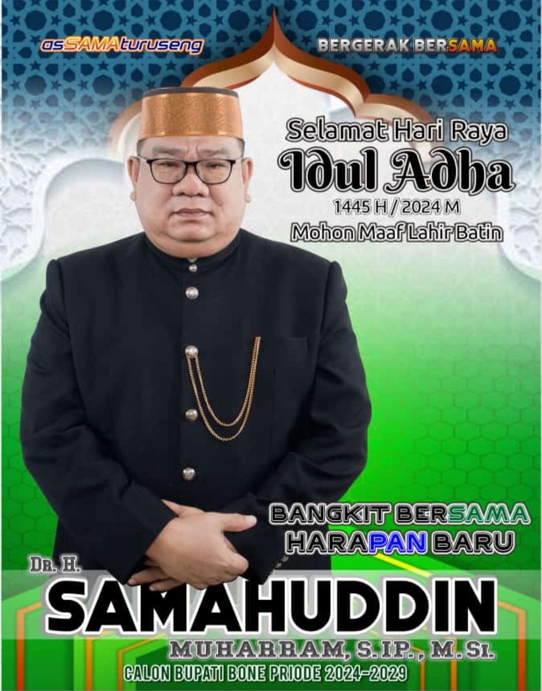 BONE-Bakal calon Bupati Bone Dr. Samahuddin mengajak warga Bone untuk saling peduli di momentum hari raya Idul Adha 1445 Hijriah.