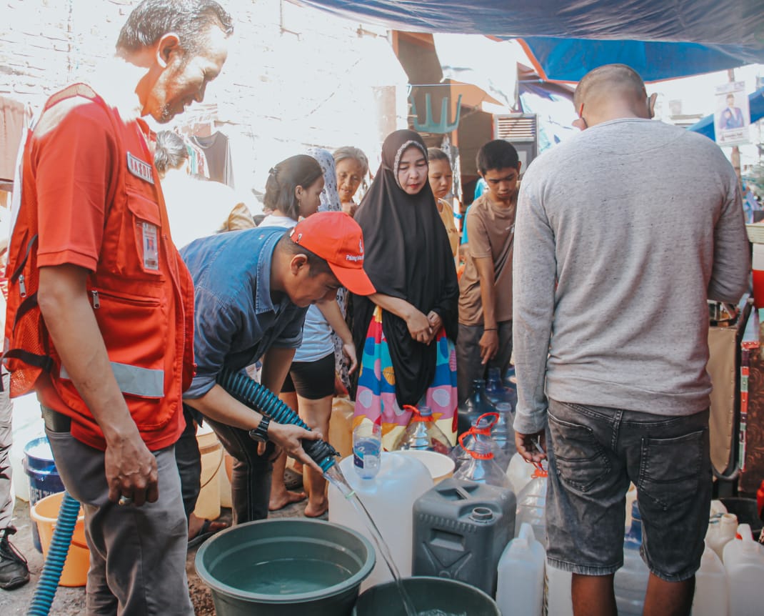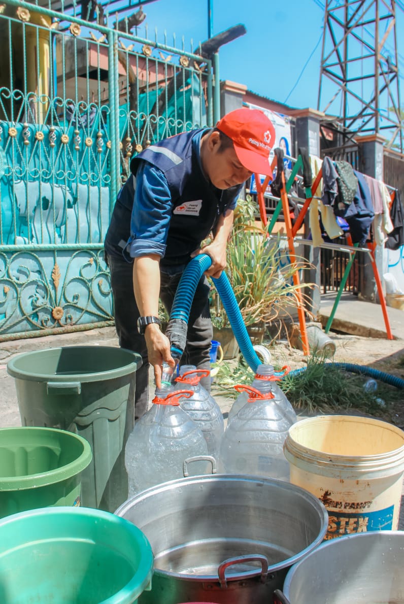 Warga antusias antri dengan wadahnya masing-masing yang dibawa dan menerima bantuan air gratis dari PMI.