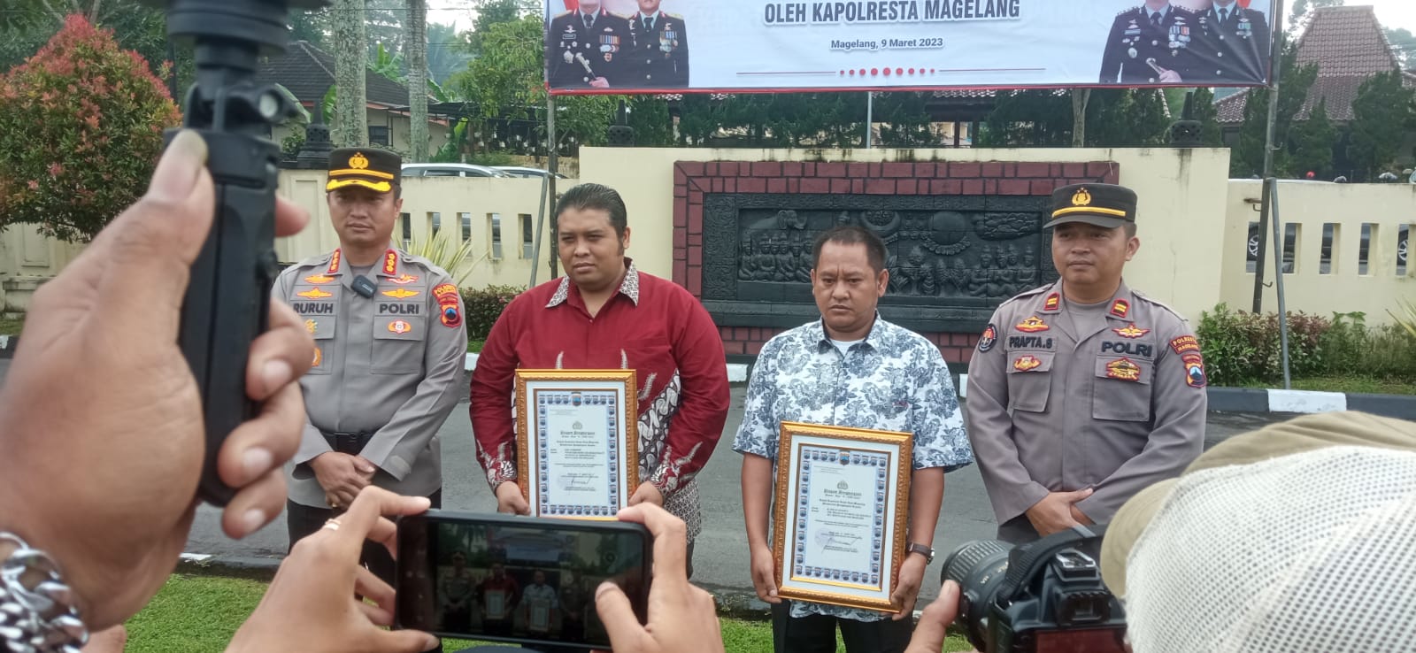 “Terimakasih kepada Pak Didik Hermawan bersama temannya atas kepedulian anda membantu kepolisian menggagalkan dan menangkap pelaku kejahatan anak jalanan di wilayah Polsek Mertoyudan, Polresta Magelang,” ujar Kombes Pol Ruruh saat memimpin apel pemberian penghargaan kepada tiga warga tersebut di halaman depan Mapolresta Magelang, Kamis, 9 Maret 2023 pagi.