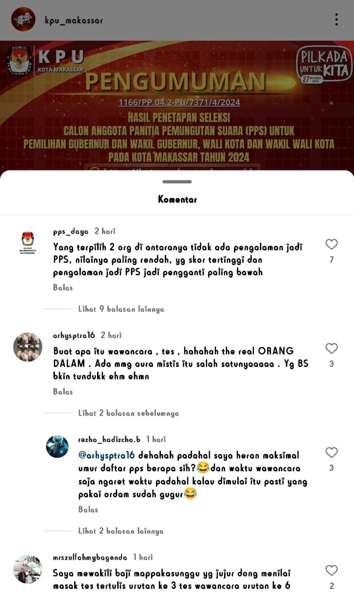 “Buat apa itu wawancara, tes, hahahah the real ORANG DALAM. Ada memang aura mistis itu salah satunyaaaaa. yang bisa bikin tunduk ehm ehmn,” tulis akun arhysptra16, dalam kolom komentar KPU Makassar, Senin (27/05/2024).