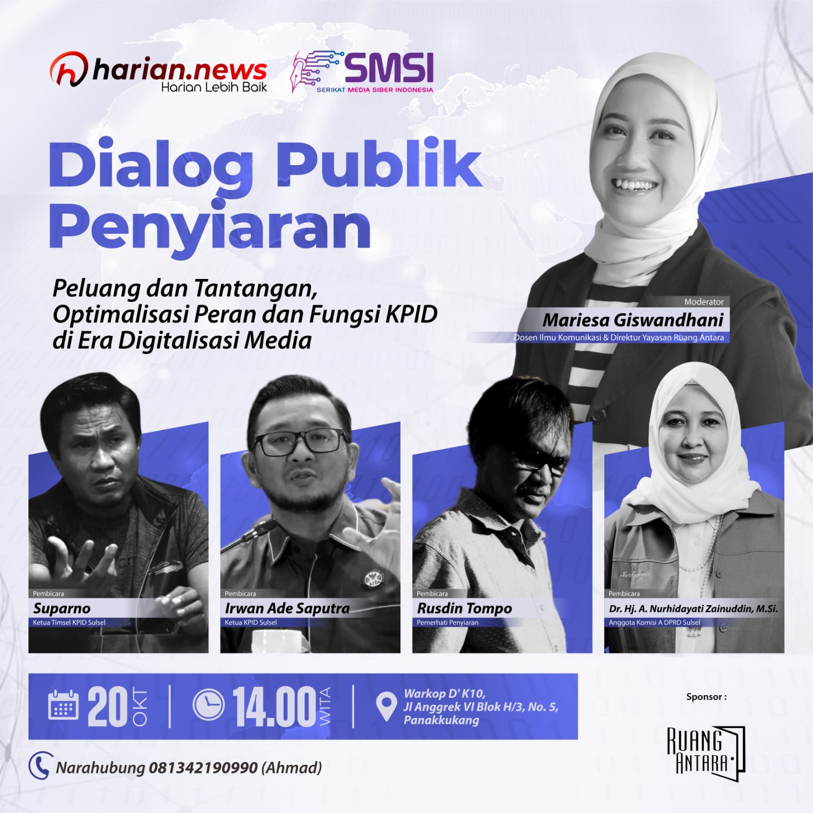 MAKASSAR, HARIAN.NEWS – Media online Harian.news, yang juga Anggota dari Serikat Media Siber Indonesia (SMSI) Sulsel, akan menyelenggarakan dialog penyiaran dengan menghadirkan beberapa narasumber yang kompeten.