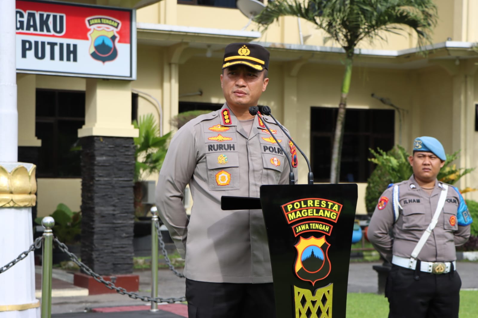 Kapolresta Kombes Pol Ruruh Wicaksono memimpin apel pagi jam pimpinan, Senin (27/3/2023) pagi di halaman depan Mapolresta Magelang. (Ft. Humas/Mohis/HN)