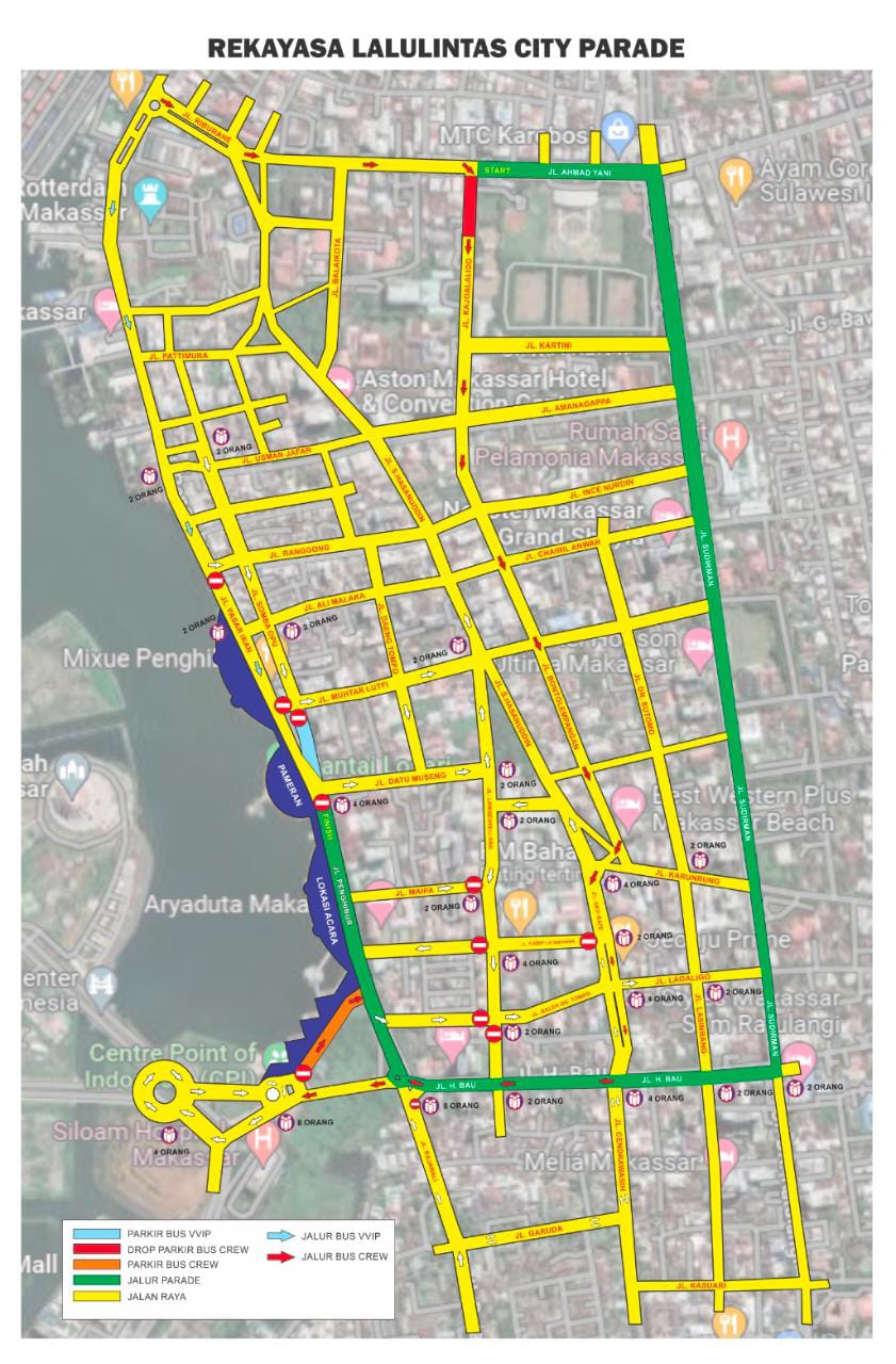 - Dari arah Jalan Lamadukelleng, kendaraan tidak boleh melintas lurus mengarah ke Jalan Haji Bau. Jalan ditutup mulai di perempatan Jalan Ince Saleh Daeng Tompo.