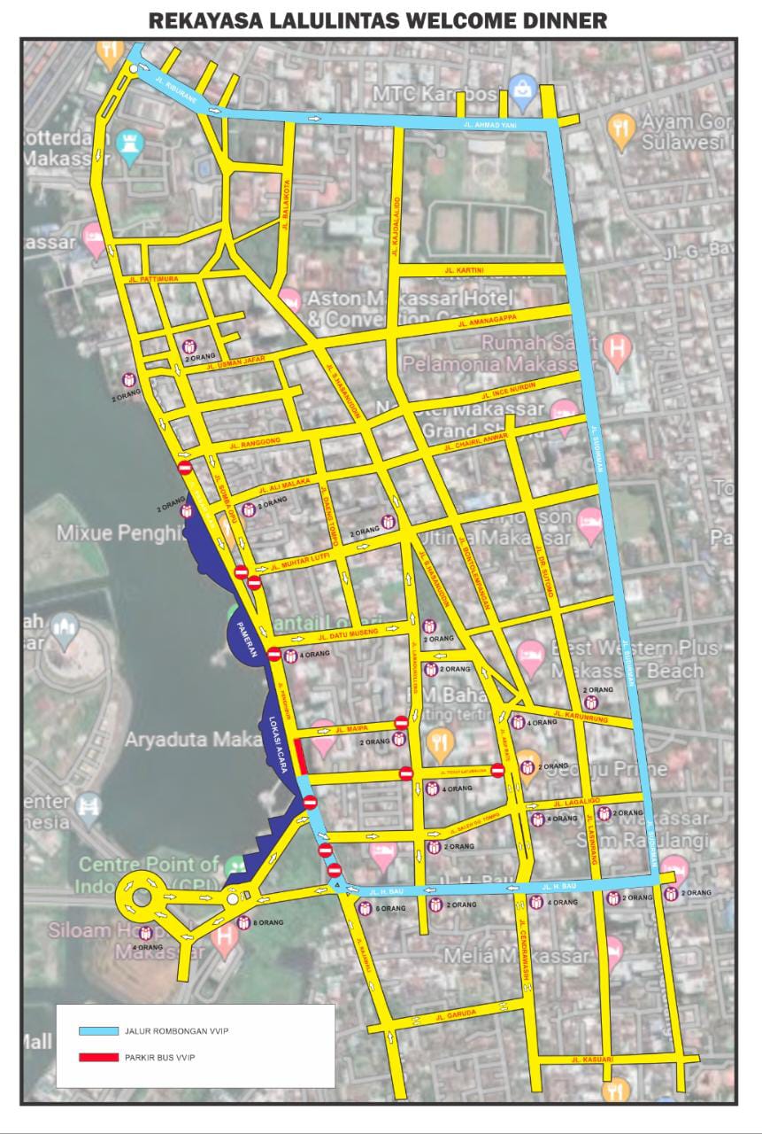 - Dari arah Jalan Metro Tanjung Bunga, kendaraan tidak boleh melintas mengarah ke Jalan Penghibur. Harus belok kanan ke Jalan Ince Saleh Daeng Tompo