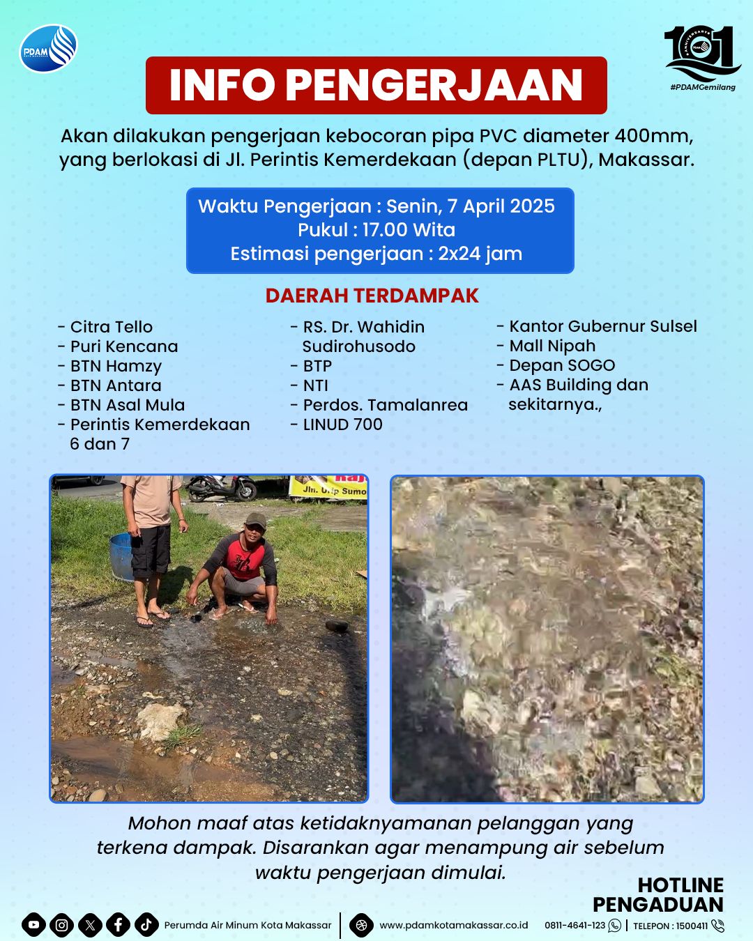 Tak lupa, Kabag Humas PDAM Makassar ini menyampaikan permohonan maaf atas ketidaknyamanan pelanggan yang terkena dampak.