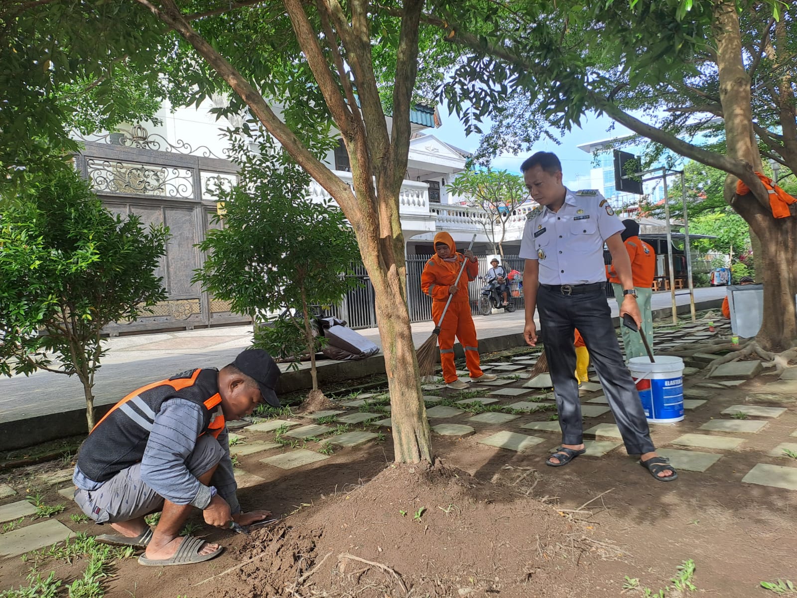 Camat Tallo, Alamsyah Sahabuddin (pakaian dinas) memantau penataan taman, Rabu (8/3).