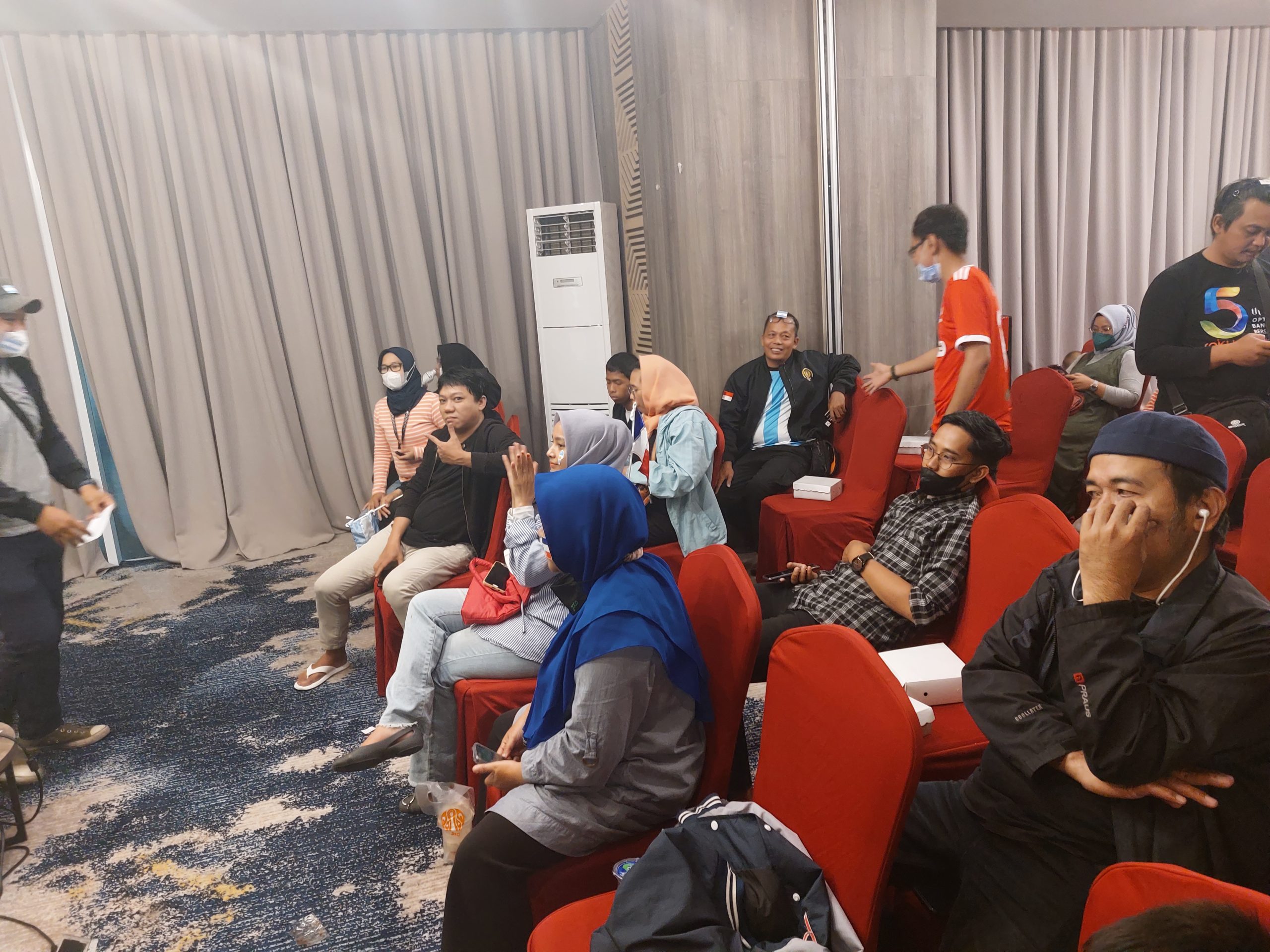 Puluhan wartawan ikut dalam nobar dengan atribut jersey kedua negara yang berlaga yang menambah semarak acara.