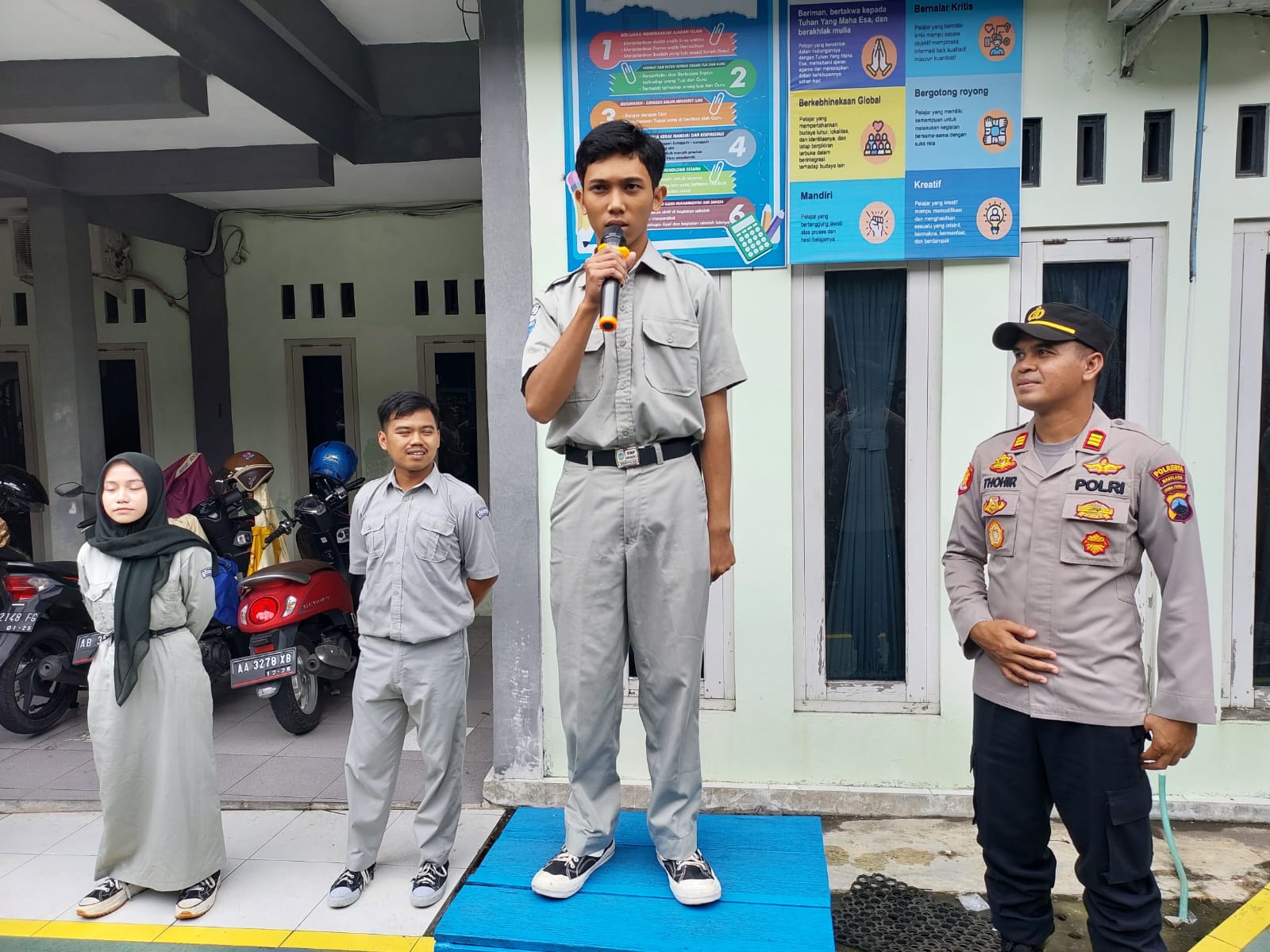 Kapolsek AKP Abdul Muthohir sedang berbincang dengan beberapa siswa usai pimpin apel kedisiplinan ratusan siswa. (Ft. Mohis/HN)