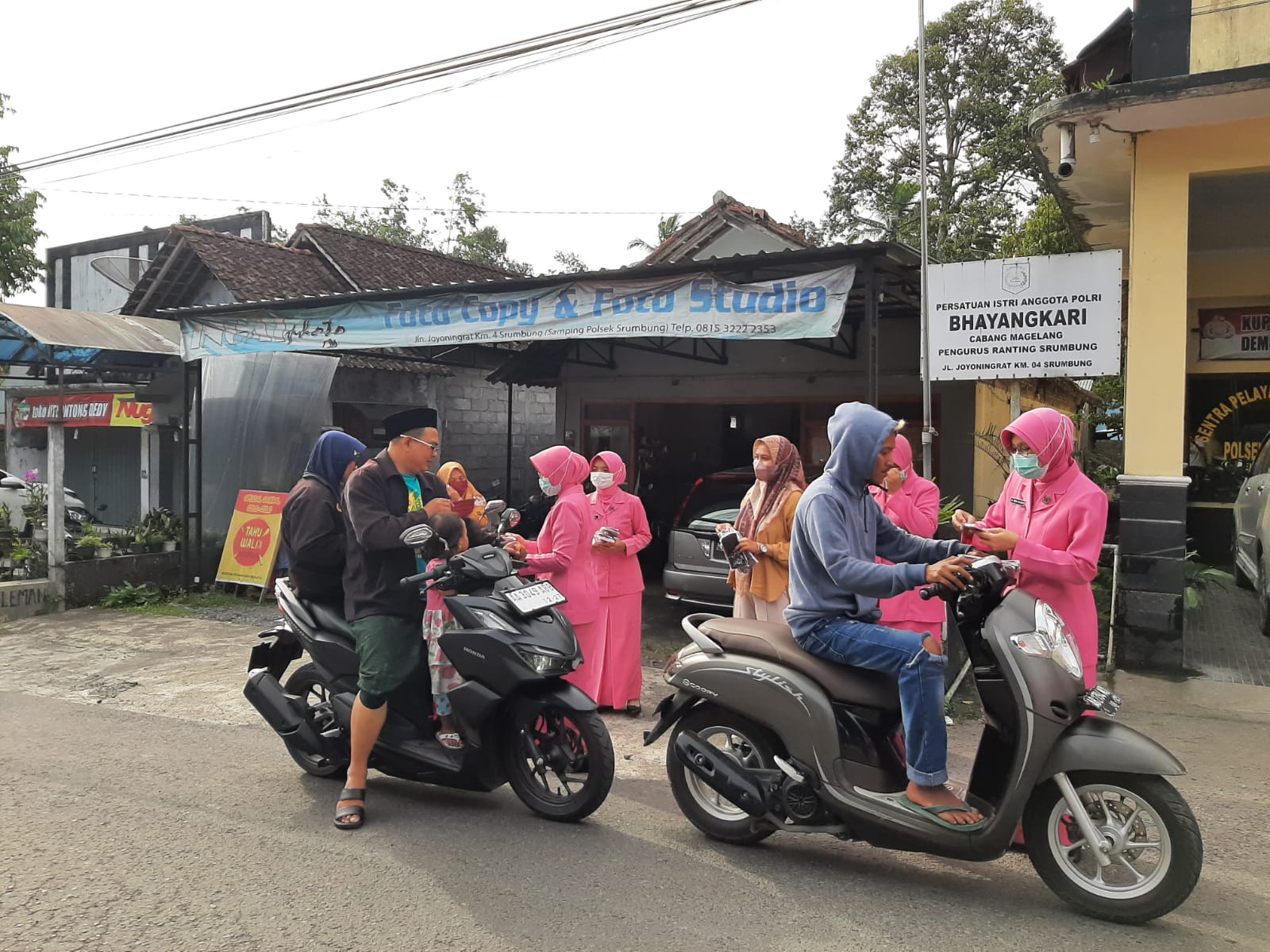 Ibu-ibu Bhayangkari turun langsung ke jalan bagi masker ke masyarakat akibat erupsi Gunung Merapi hingga menimbulkan hujan abu. (Ft. HMS/Mohis/HN)