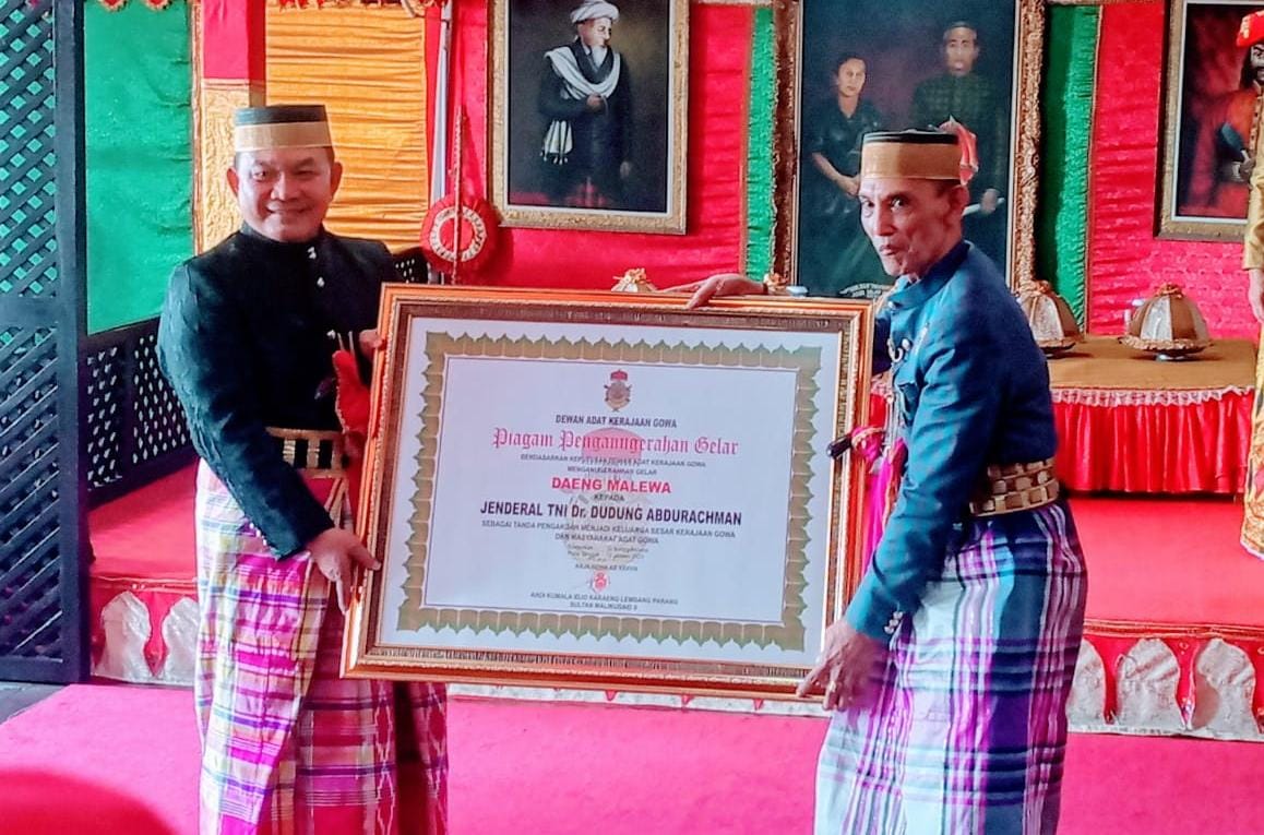 “Memberi gelar nama adat Gowa kepada Bapak Jenderal TNI Dudung Abdurachman yang diberi nama Pakdaengan Gowa bernama Daeng Malewa,” tulis Adnan dalam SK yang dibacakan.