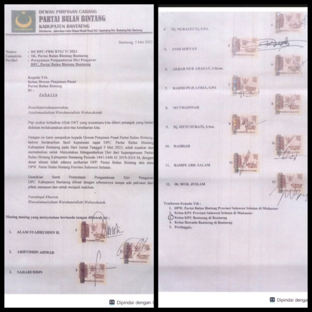 Dalam surat yang ditujukan kepada DPP Partai Bulan Bintang di Jakarta, bernomor :04/DPC-PBB/BTG/V/2023 dengan lampiran SK Partai Bulan Bintang Bantaeng periode 2019-2024 tersebut, di jelaskan keputusan mundurnya pengurus DPC PBB Bantaeng berdasarkan rapat DPC pada hari Jumat, 5 Mei 2023.