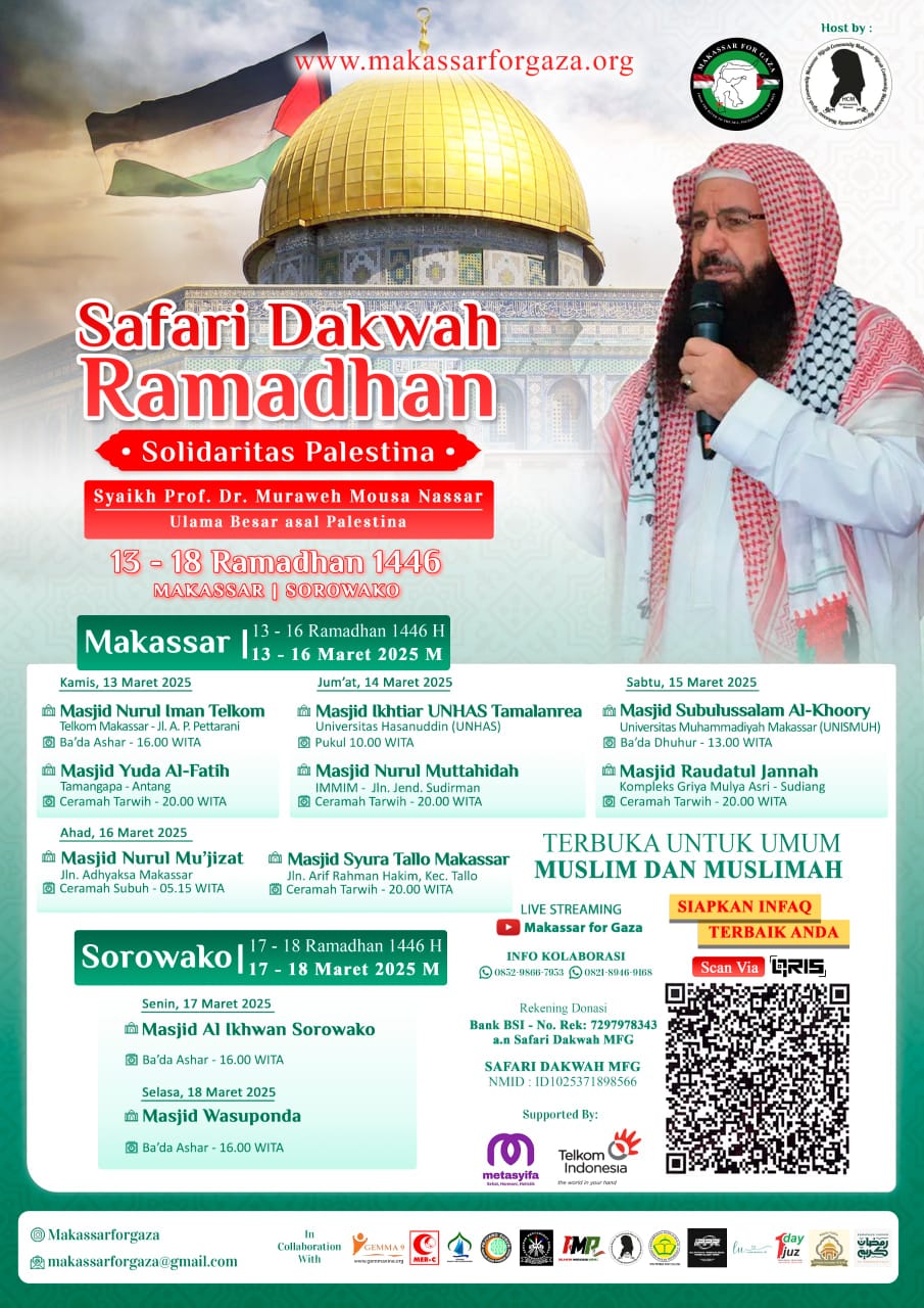 Safari dakwah ini mengundang Syaikh Prof. Dr. Muraweh Mousa Nassar, ulama besar asal Palestina, untuk berbagi ilmu dan menyampaikan orasi kemanusiaan kepada masyarakat Sulawesi Selatan mengenai kondisi terkini di Palestina.