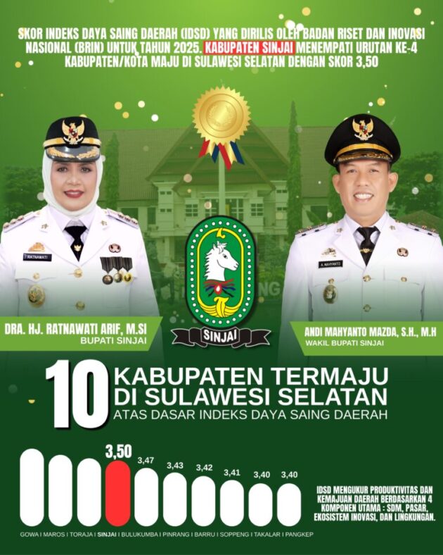 HARIAN.NEWS,SINJAI-Torehan gemilang kembali di sabet Kabupaten Sinjai dalam pemetaan daya saing daerah. Berdasarkan skor Indeks Daya Saing Daerah 2025 yang dirilis oleh Badan Riset dan Inovasi Nasional (BRIN), Sinjai berhasil meraih peringkat keempat sebagai kabupaten termaju di Sulawesi Selatan.