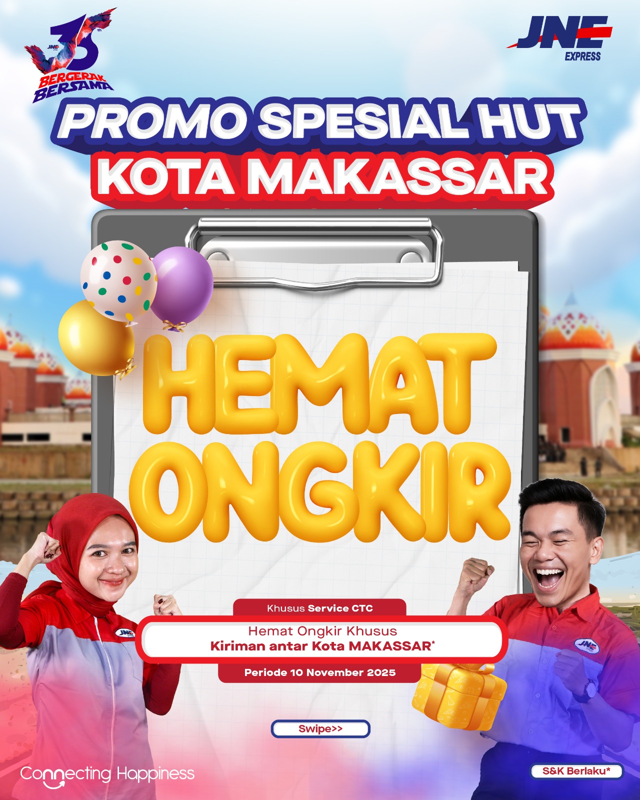 Promo ini berlaku bagi seluruh agen JNE di wilayah Makassar dan dapat dinikmati masyarakat khusus hari ini, Senin, 10 November 2025.