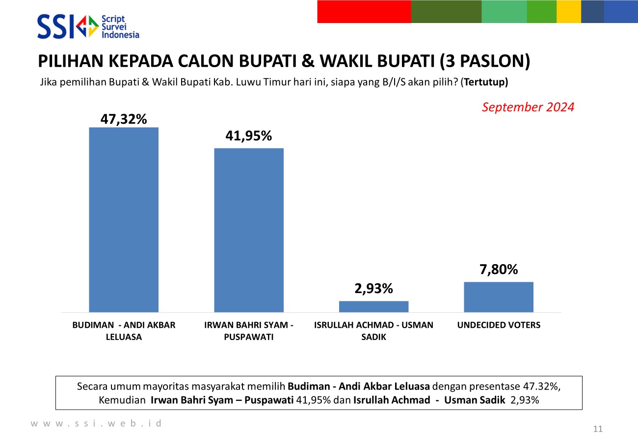 Hasil Survei menempatkan Budiman – A. Akbar Leluasa pada posisi teratas dengan perolehan 47.32%, kemudian Irwan Bahri Syam – Puspawati 41.95%, dan Isrullah – Usman Sadik 2,93%, sementara yang belum menentukan pilihan 7,80%. Detail Perolehan Suara Per Kecamatan Budiman – Akbar Sementara Unggul di 7 Kecamatan (Malili, Angkona, Wotu, Burau, Tomoni, Tomoni Timur, Kalaena) dan Ibas – Puspawati 41.95% unggul di 4 Kecamatan (Mangkutana, Nuha, Wasuponda, Towuti)