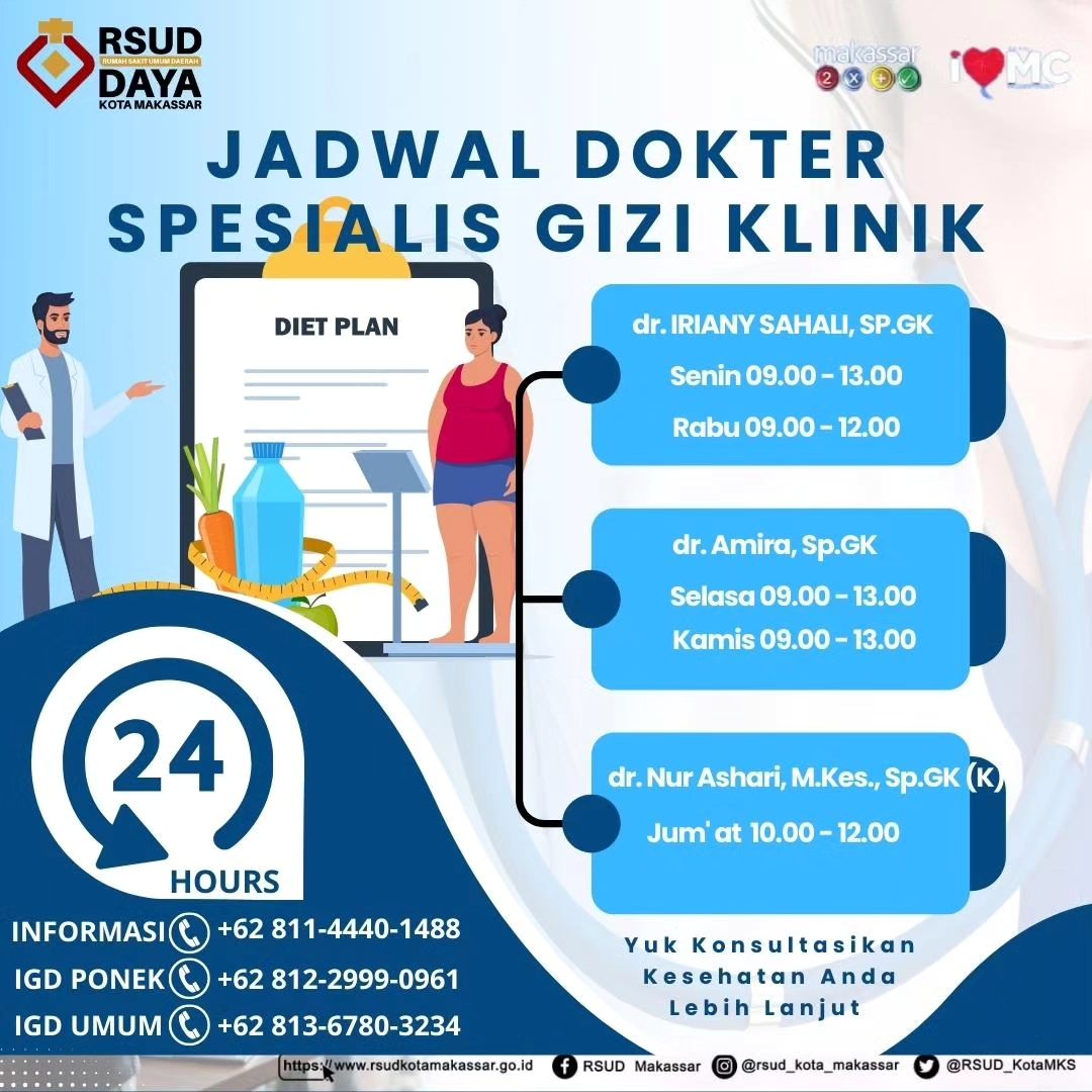 Jadwal dokter spesialis Gizi Klinik RSUD Daya Makassar :