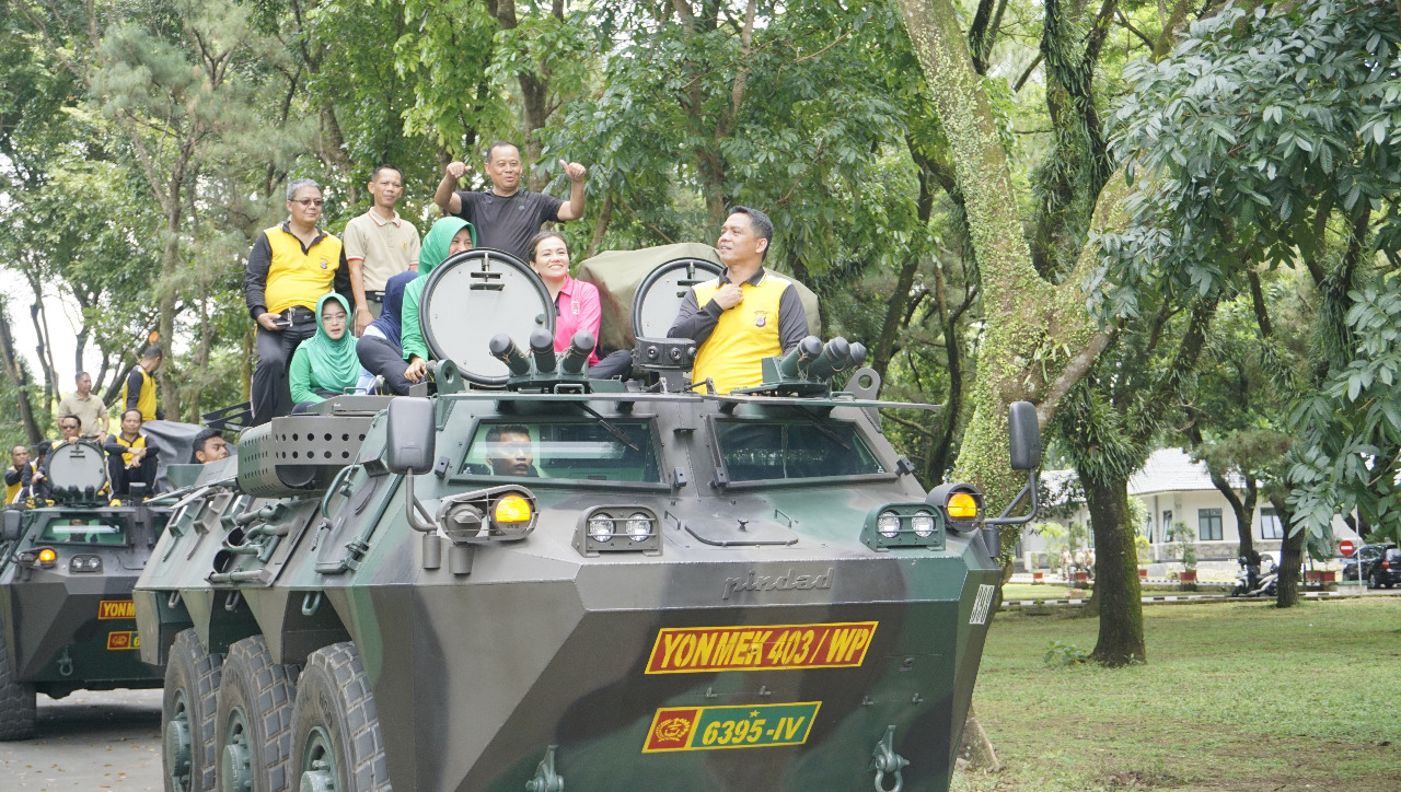Danrem 072/Pmk naik tank Anoa bersama Gubernur AAU, Kapolda DIY usai olahraga bersama TNI tiga Matra dan Polri se DIY. (Ft. Mohis/HN)